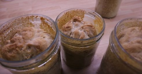 Wenn die Gläser gefüllt sind, legst du ein Tuch auf ein Backblech, füllst es mit 1 cm Wasser auf und stellst die offenen Gläser darauf. Dieses gibst du in den auf 160° C vorgeheizten Backofen und backst sie für 30 Minuten (abhängig von der Größe der Gläser), bis das Brot fertig gebacken ist. Wenn das Brot über den Rand hinaus gebacken ist, nimm es heraus und schneide ein paar cm ab, sodass der Deckel auf das Glas passt.